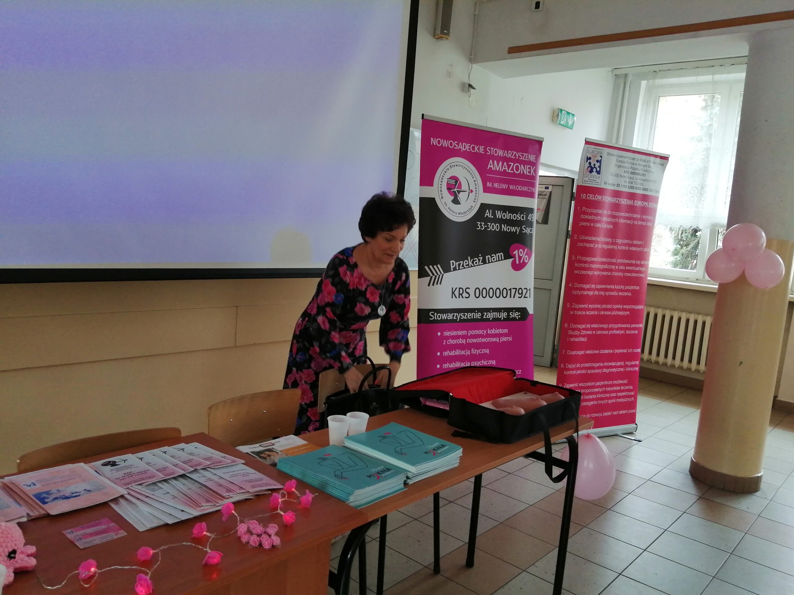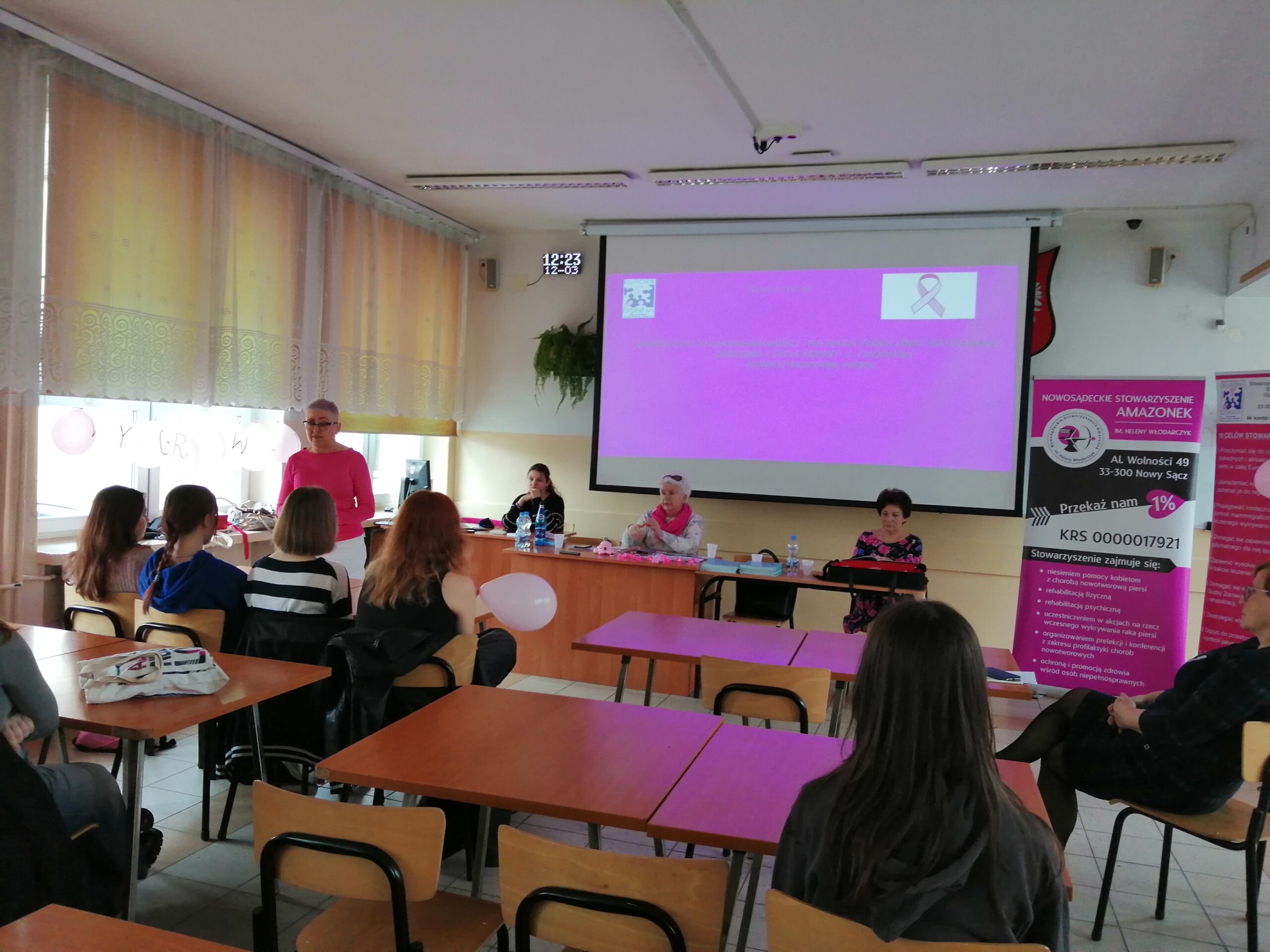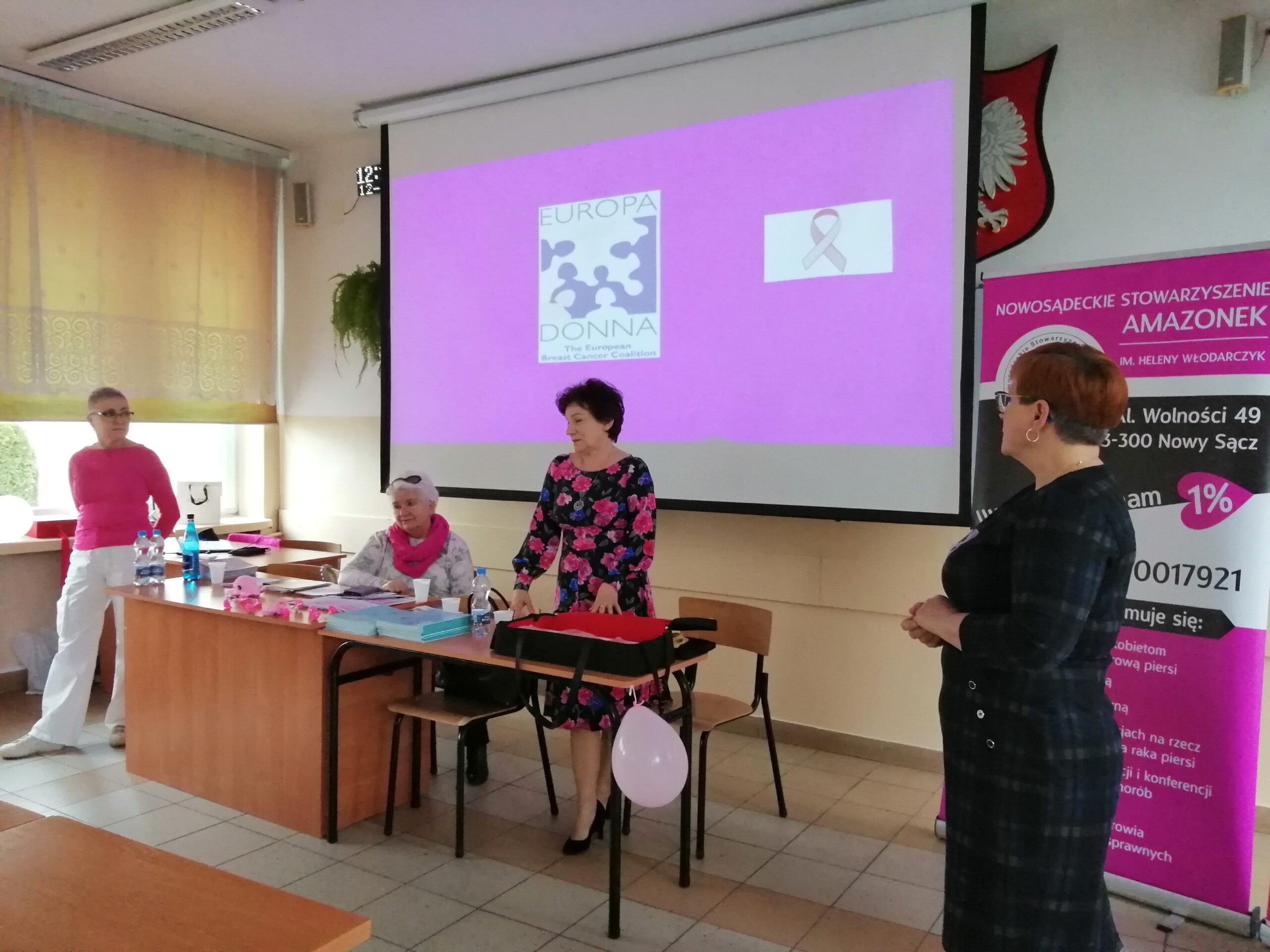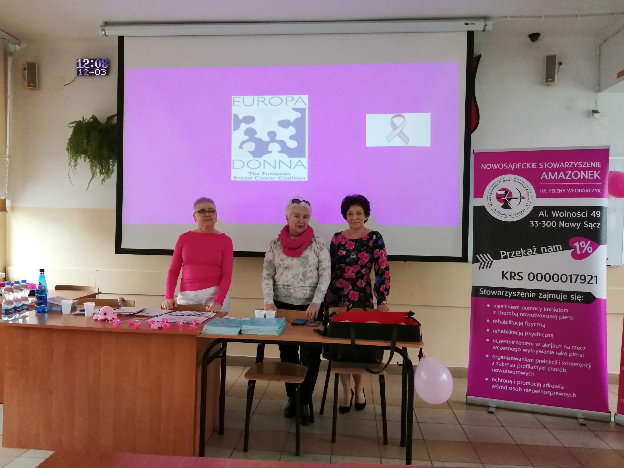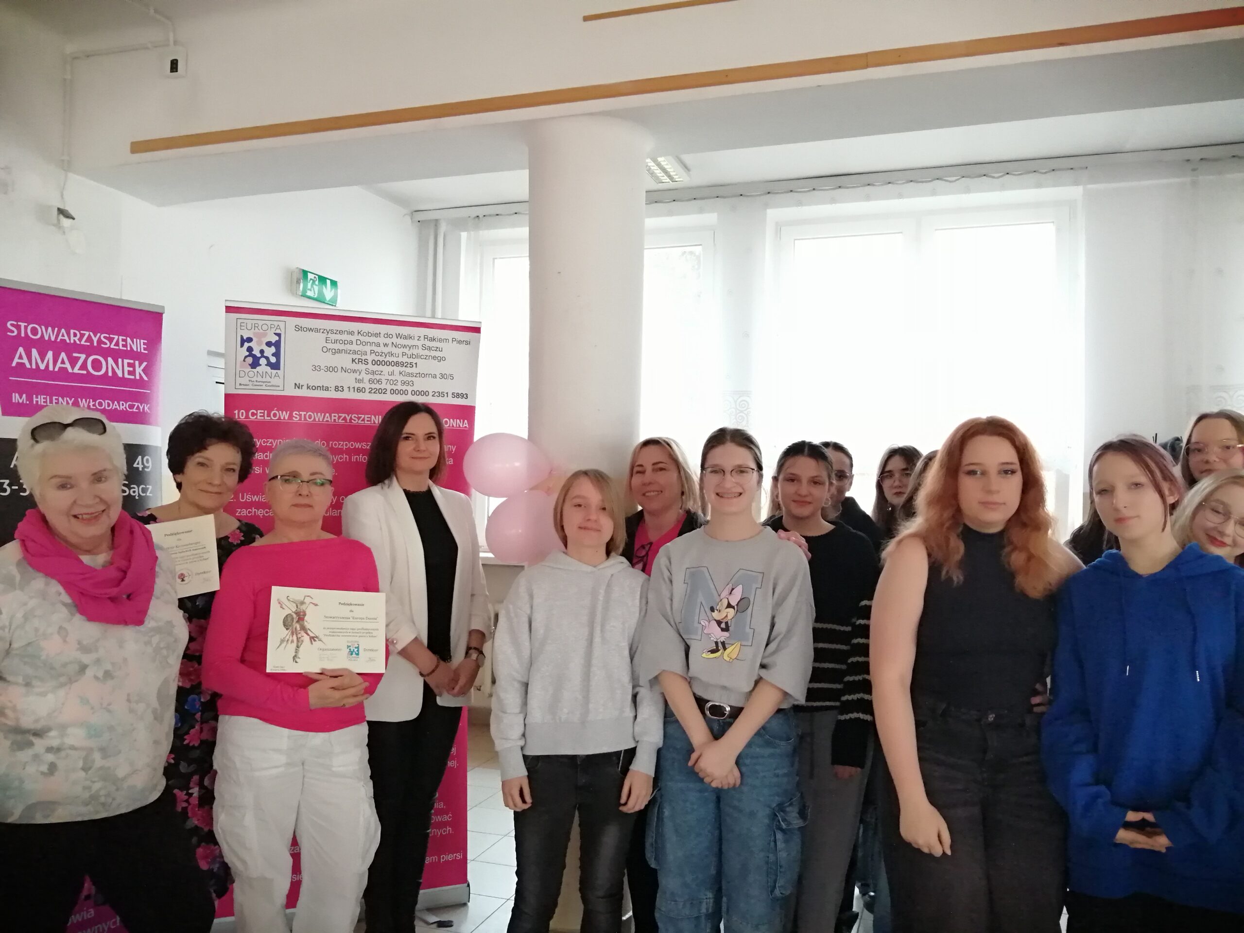 Zajęcia przeprowadziły panie ze Stowarzyszenia Europy Donny oraz pani Krystyna Kronenberger ze Stowarzyszenia Sądeckich Amazonek. Oba Stowarzyszenia zajmują się niesieniem wszelakiej pomocy kobietom, uświadamiają o zagrożeniu rakiem oraz zachęcają do regularnej kontroli własnych piersi i regularnej aktywności fizycznej. Zdrowy styl życia to podstawa, aby cieszyć się zdrowiem i życiem. Pamiętajmy o tym.