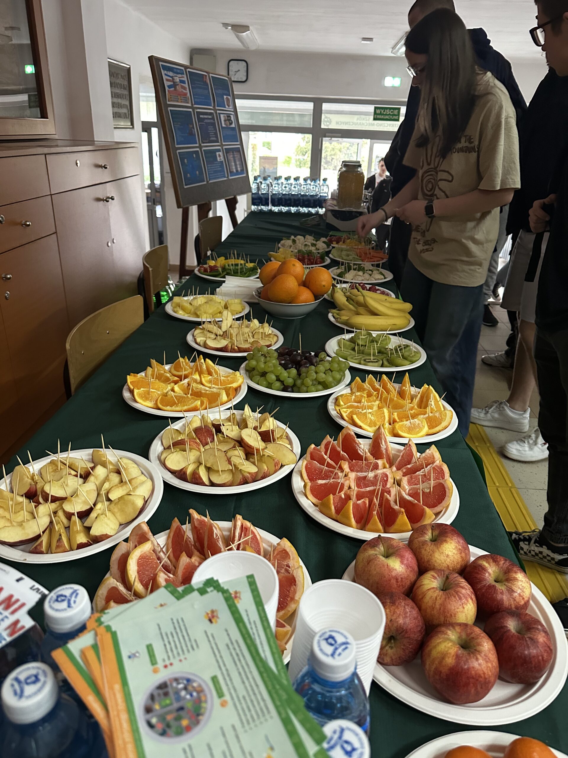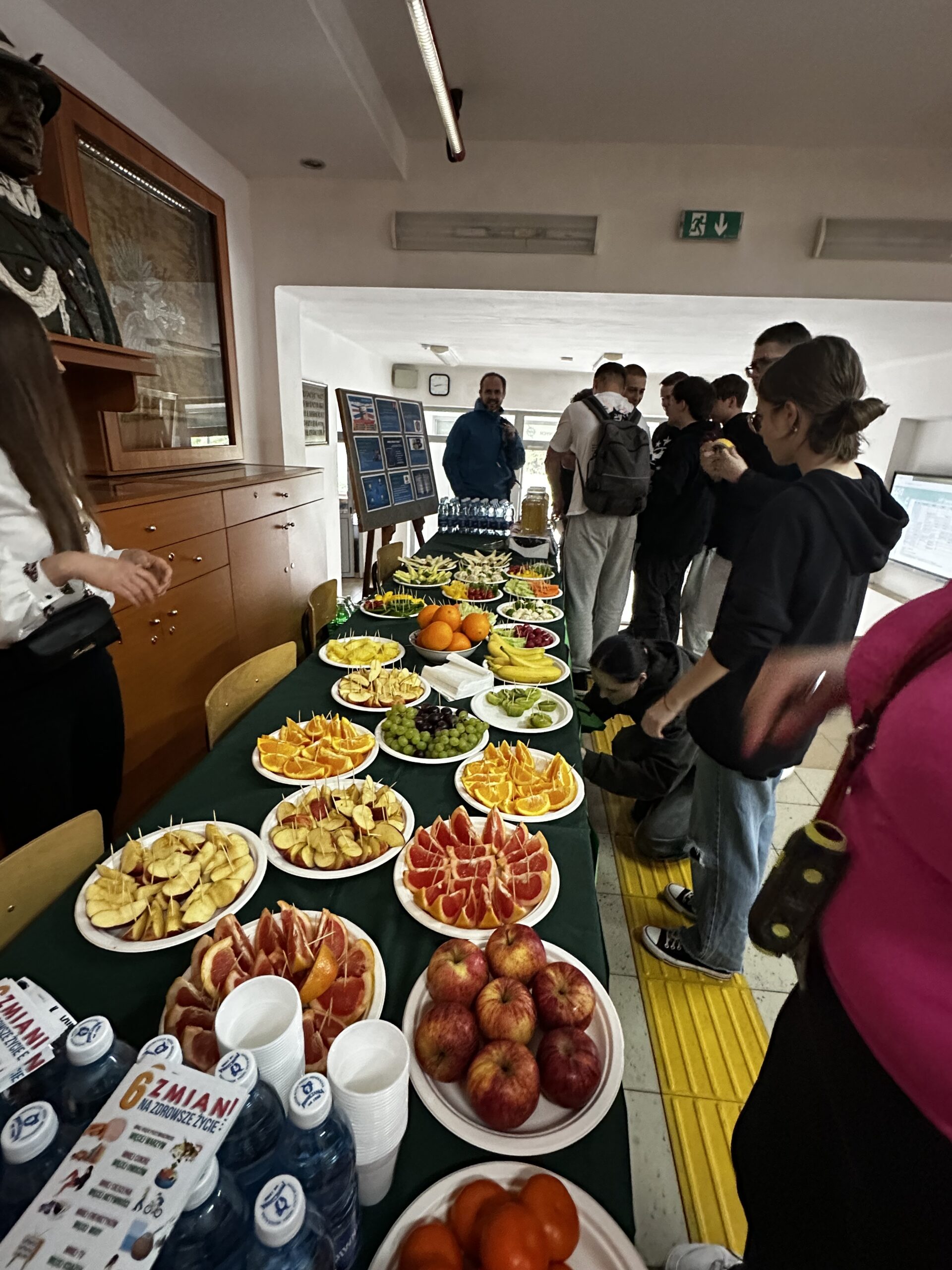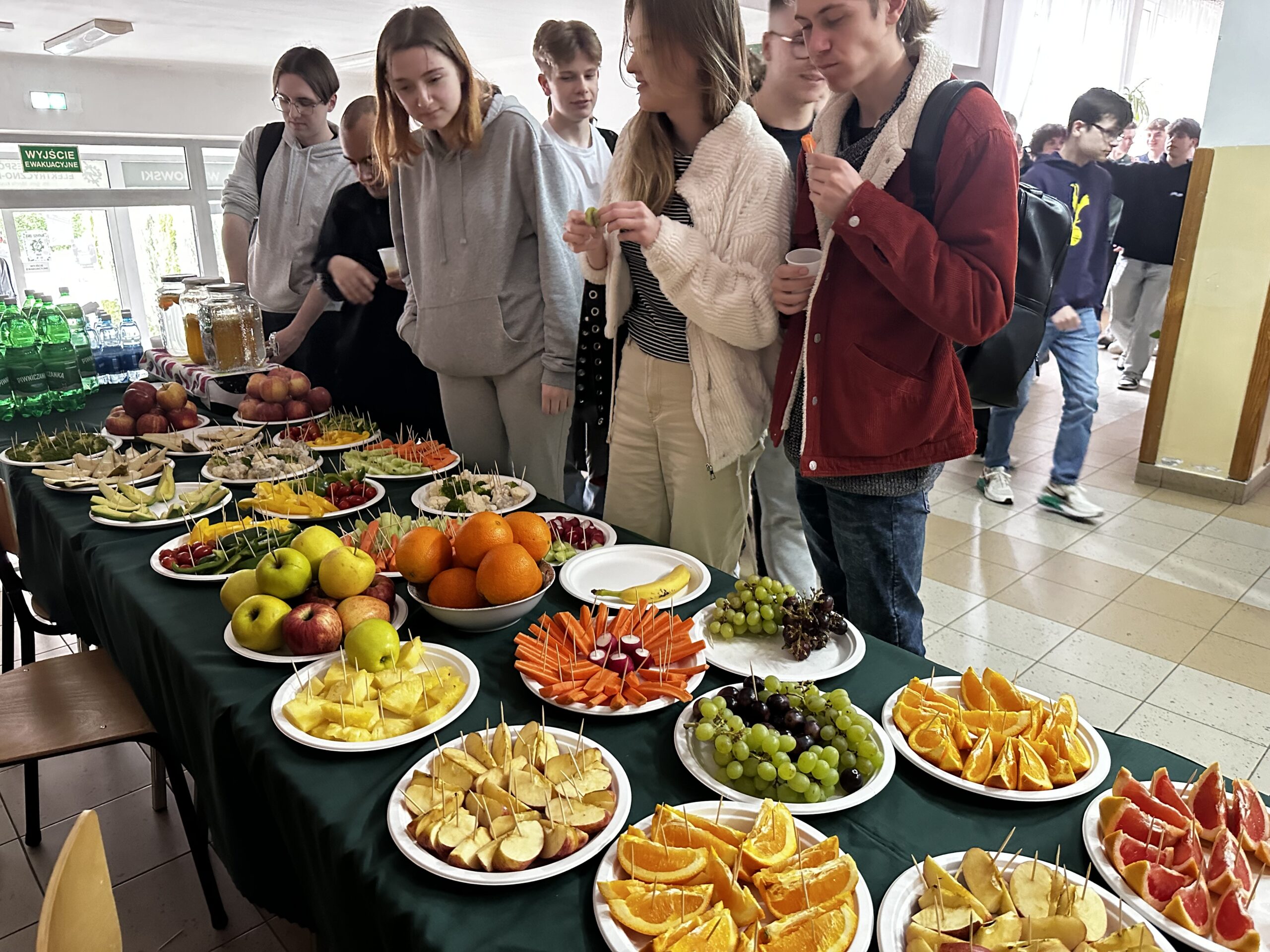 Uzupełnieniem tego wydarzenia był kiermasz owocowo – warzywny zorganizowany we współpracy z wolontariuszami oraz uczniami klasy 1d, który cieszył się ogromnym zainteresowaniem. Uczniowie mogli spróbować zdrowych przekąsek owocowo – warzywnych oraz napojów na bazie świeżo wyciskanych owoców. Mamy nadzieję, że zdrowe odżywianie stanie się naszą codziennością, a także sprawi, że świadomość wyboru potraw