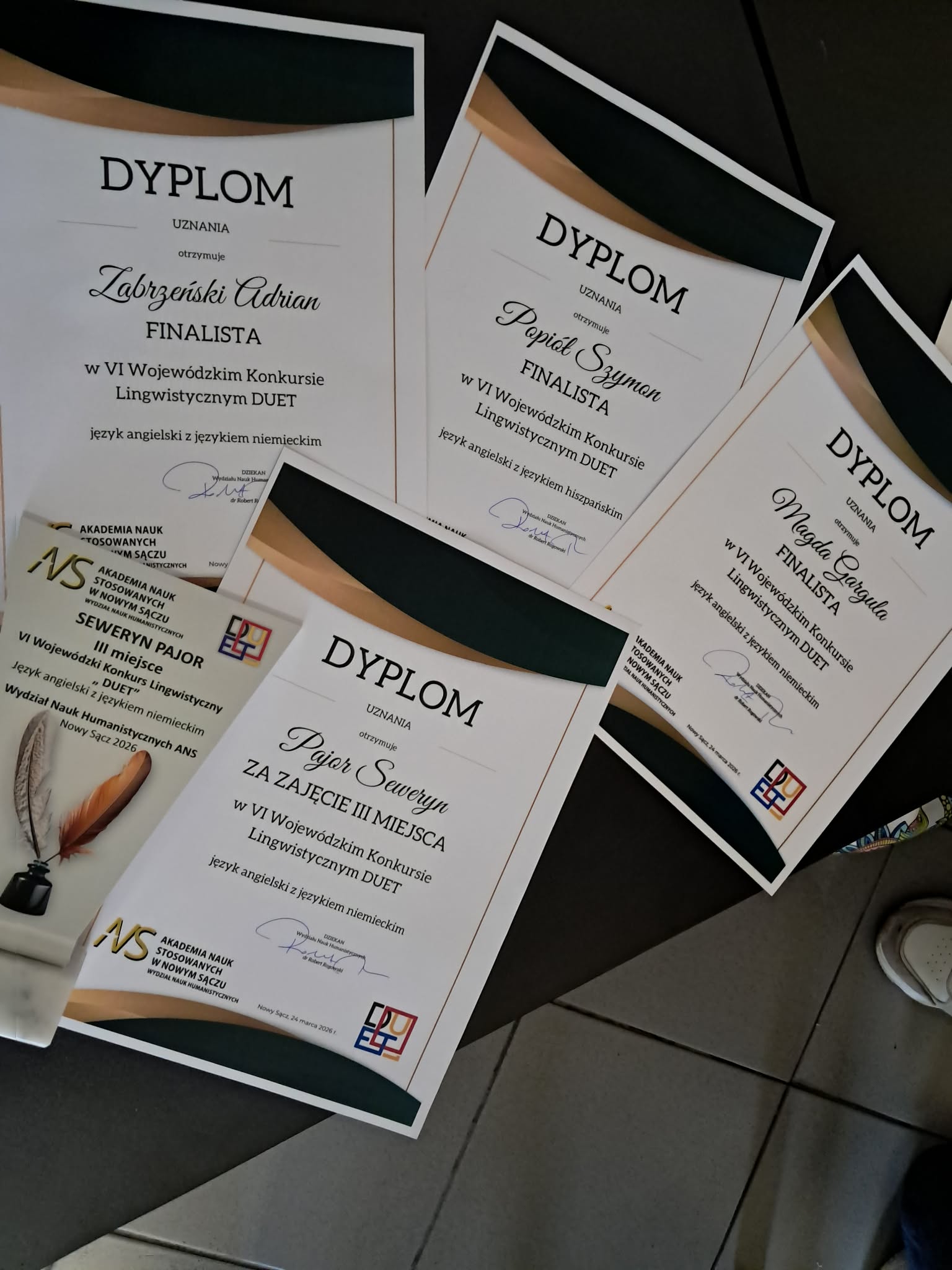 – Adrian Zabrzeński z kl. 4p otrzymujący tytuł finalisty (j. angielski i niemiecki),