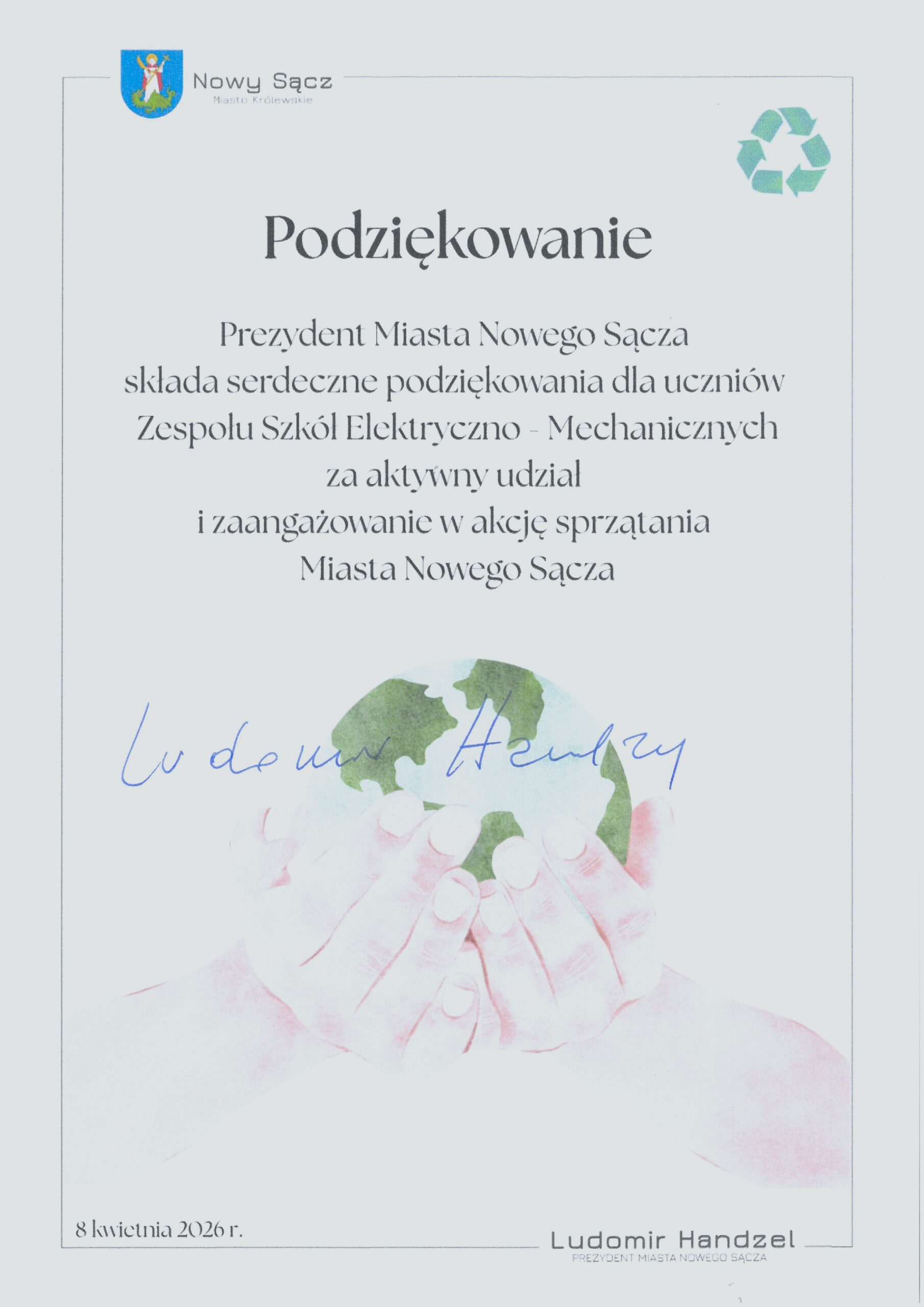 8 kwietnia 2026 roku nasza młodzież wzięła aktywny udział w wiosennej akcji sprzątania miasta. Inicjatywa ta wpisuje się w cykliczne działania ekologiczne podejmowane przez sądeckie placówki oświatowe pod patronatem Urzędu Miasta. Celem akcji było uporządkowanie terenów zielonych w okolicach szkoły oraz wybranych traktów spacerowych w Nowym Sączu po okresie zimowym. W akcję włączyły się klasy IVj i IIIt pod opieką nauczycieli wychowawców, wykazując się dużą dyscypliną i troską o lokalne środowisko. Udało się zebrać sporo odpadów (głównie tworzyw sztucznych, szkła i papieru), co realnie poprawiło estetykę i bezpieczeństwo przestrzeni publicznej. Udział młodzieży z „Elektryka” służył nie tylko doraźnej pomocy miastu, ale także kształtowaniu postaw proekologicznych i odpowiedzialności za wspólne dobro. Akcja ta potwierdza, że uczniowie ZSEM w Nowym Sączu potrafią zintegrować się wokół ważnych celów społecznych, promując wizerunek szkoły jako instytucji dbającej o ekologię.